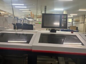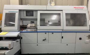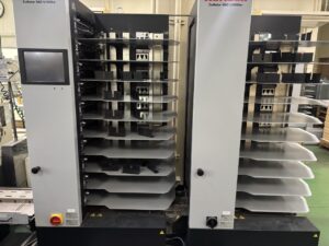 数種類の印刷物を丁合したあと半分に折り、中央部分をステッチャーで綴じ、仕上げに三方断裁する機械です。